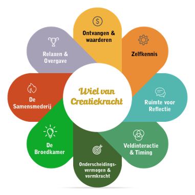 Centraal in onze aanpak staat ons Wiel van Creatiekracht©, een cyclisch model dat ons begeleidt op onze reis van inspiratie naar manifestatie. We gebruiken dit als kompas, waarbij we de natuurlijke stroming van creatie volgen en ons laten leiden door de aanwijzingen van onze intuïtie. Door te vertrouwen op deze innerlijke leiding, ontstaan je projecten organisch en vloeiend. Met het Wiel van Creatiekracht ontdek je je natuurlijke ritme van creëren.